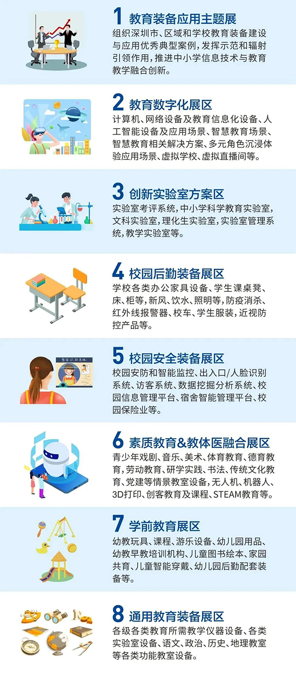 第五届深圳教育装备博览会以“数字赋能·先行示范”为主题,助力贯彻落实国家教育数字化战略行动部署,有助于深圳智慧教育示范区建设,全方位展示信息技术深度赋能教育数字化转型的深圳经验,为各级各类教育组织和教育装备企业给予新技术、新产品与新方案的展示及研讨合作平台,发挥教博会的聚集效应和辐射效应,探索教育高质量开展的新路径,先行先试,为全国教育数字化转型开展探索新路。